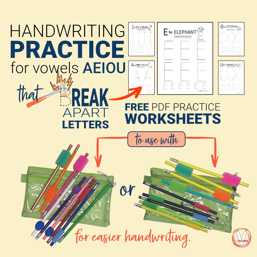 Lastly, use the set of pencil grippers which were already on pencils to help your students figure out what works best for their styles. These PDF handwriting sheets accompany "Foam and Cushy Grips on Pencils with Zipped Pouch Bundle" and "Cushy, Rubber and Foam Grips on Pencils Bundle with Case." If you want the handwriting practice sheets made easier for the whole alphabet, get it here and find a 30% discount code in this free vowel handwriting worksheet file.