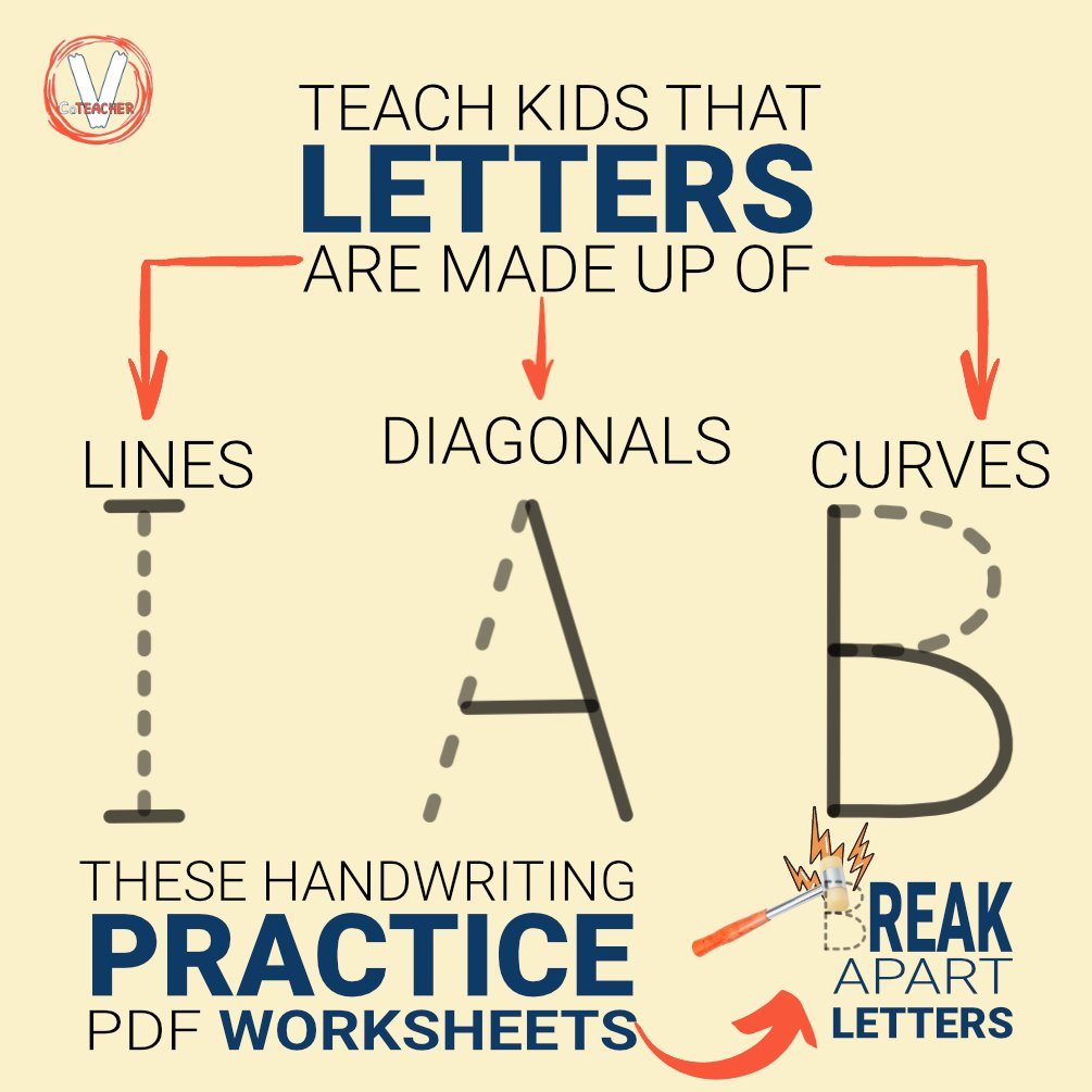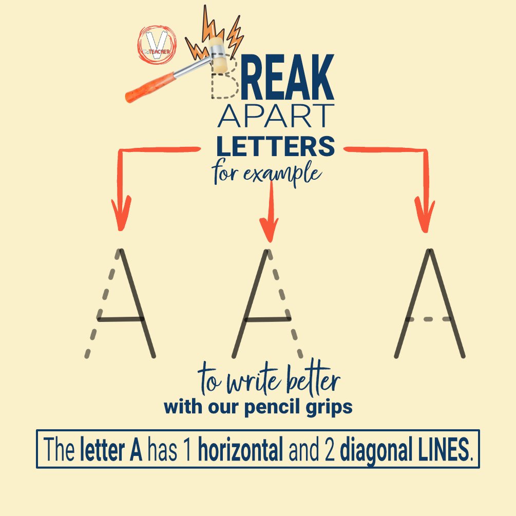 Handwriting problems will become easier to solve when your student figures out that letters are composed of different strokes: straight lines, diagonal lines and curves. For example, the letter I is a straight line except for the top and bottom smaller lines. Meanwhile, the vowel E has 4 different straight lines while A has diagonal lines.